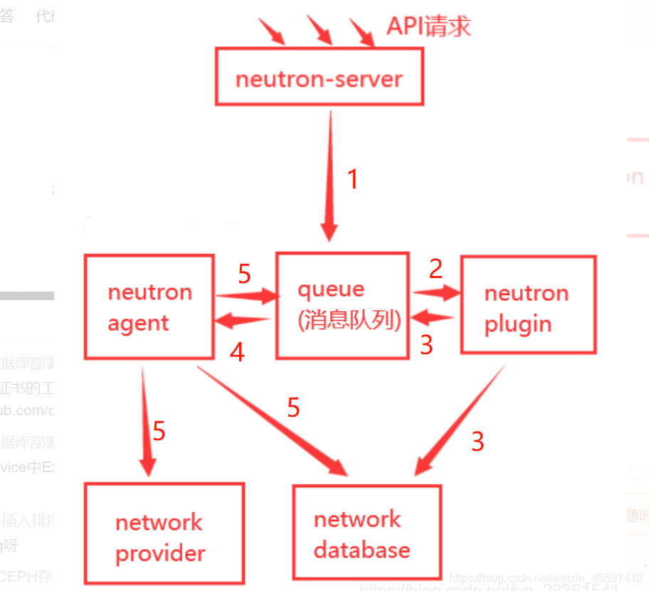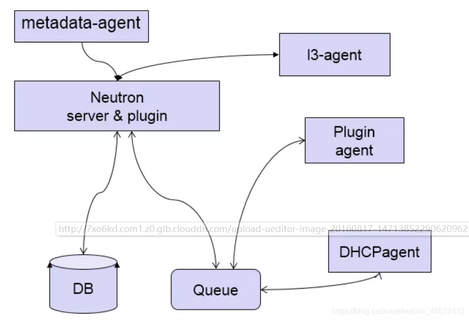 (4)messaging queue:在neutron-server和agents之间路由信息,同时作为一个数据库存储plug-ins的网络状态;