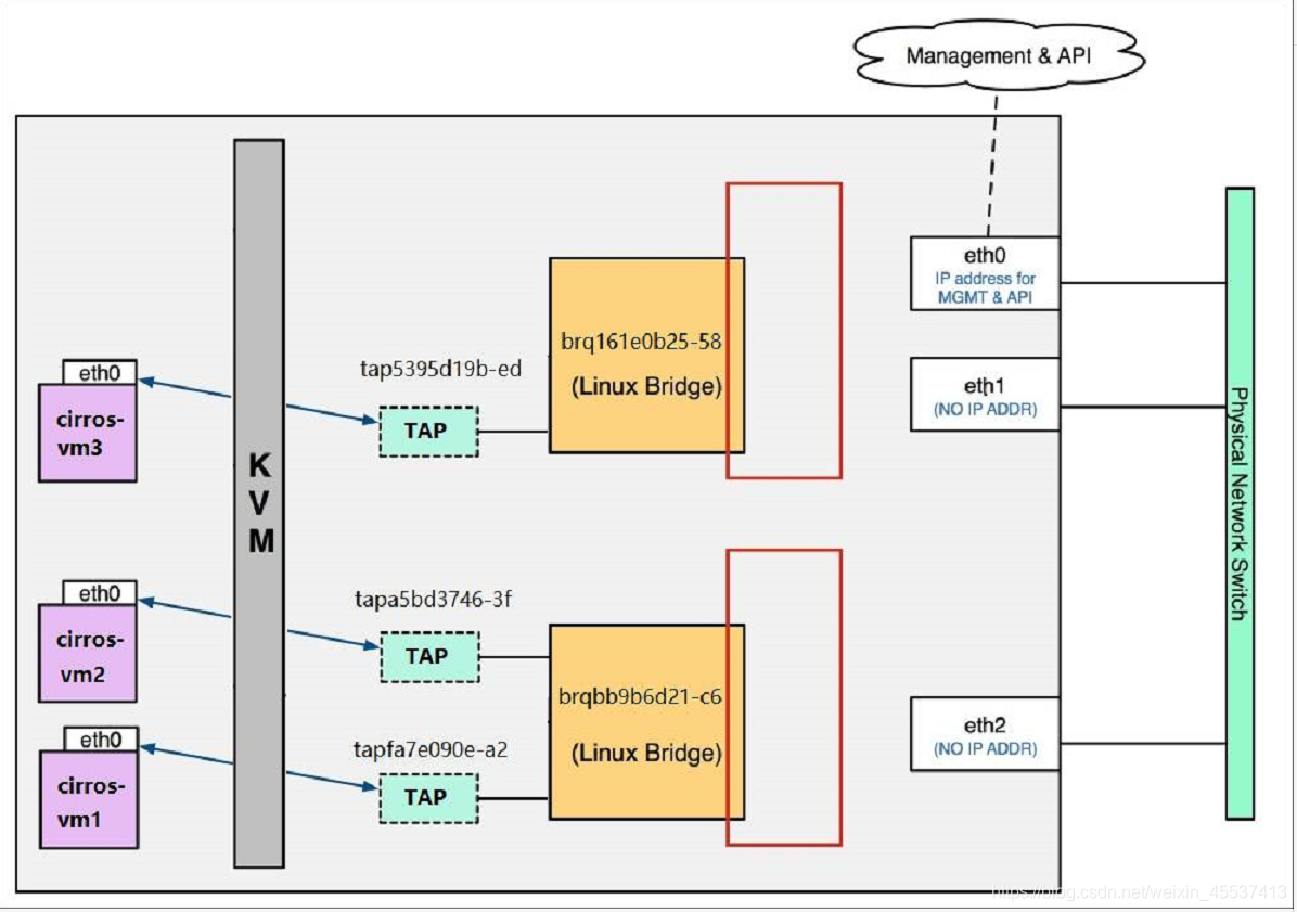 flat network 是不带 tag 的网络,要求宿主机的物理网卡直接与 linux bridge 连接,并且flat network与网卡是一一对应的关系,网络架构如下图所示。